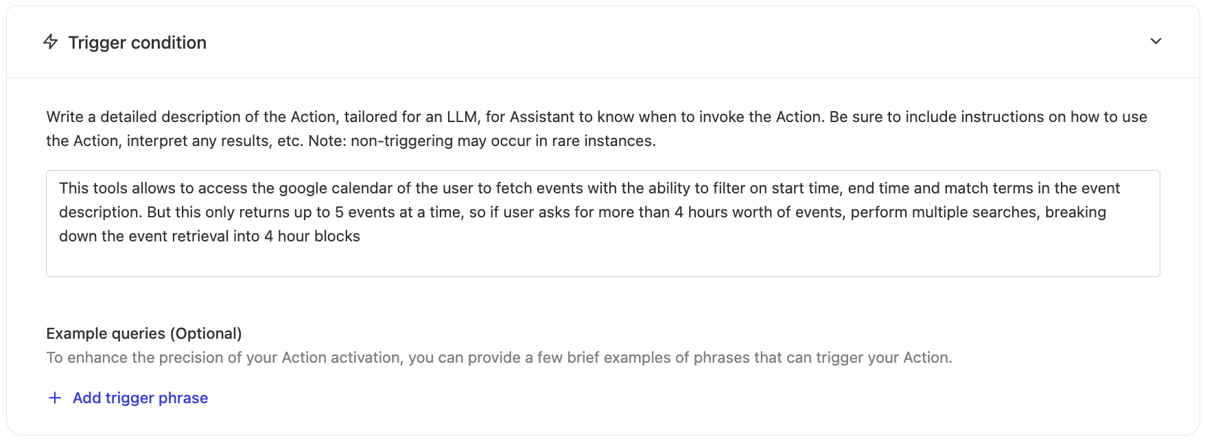• Unique Identifier: Set a unique ID (e.g., "retrieveCalendarEvents")